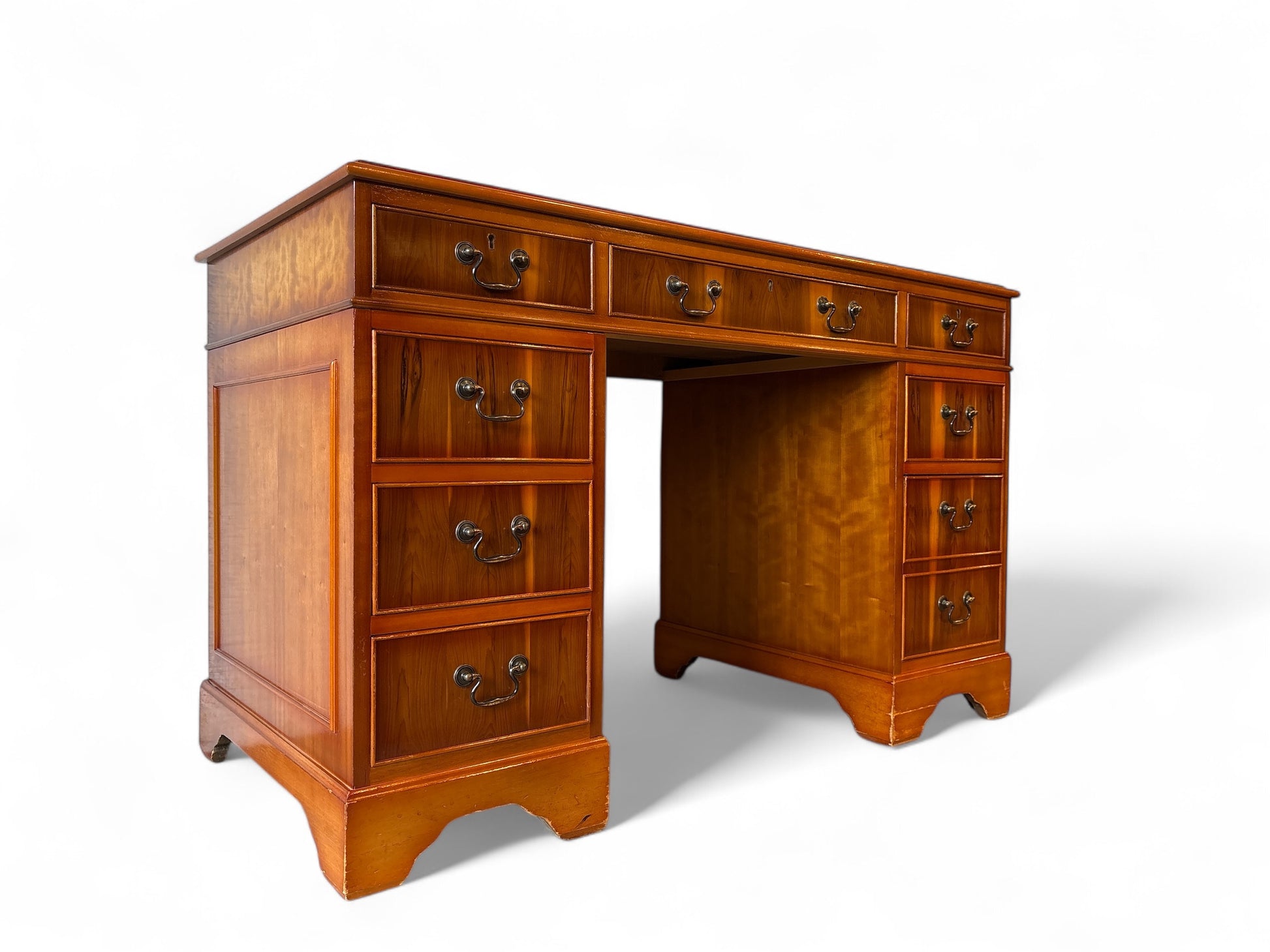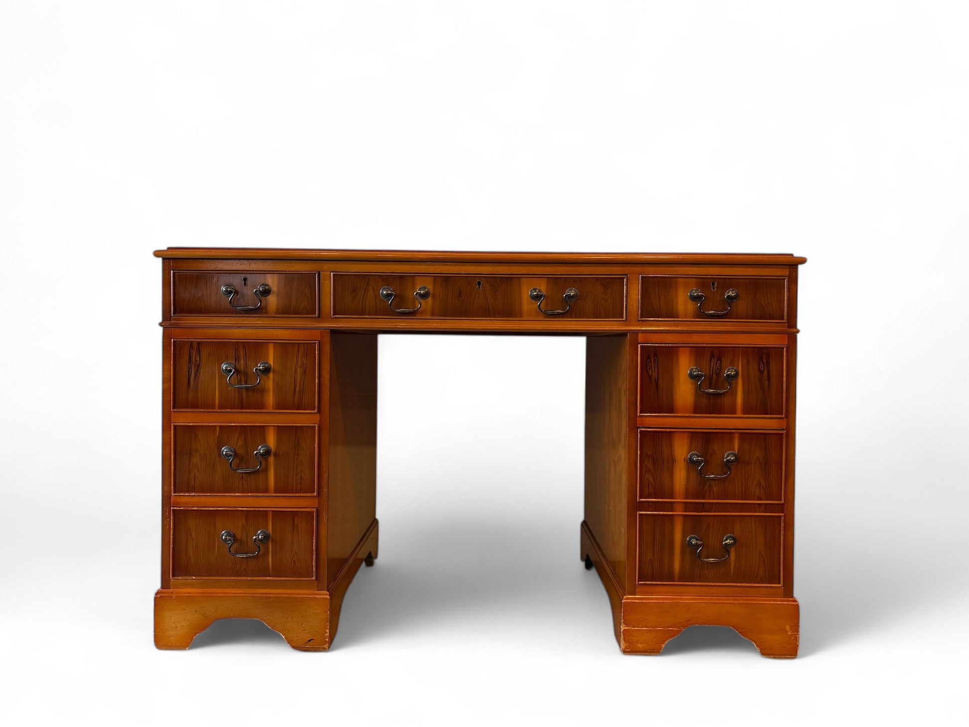 Detta robusta och välbevarade partner’s desk kombinerar funktionalitet med tidlös brittisk elegans – perfekt för hemmakontor, bibliotek eller arbetsrum där klassiskt hantverk får ta plats.
