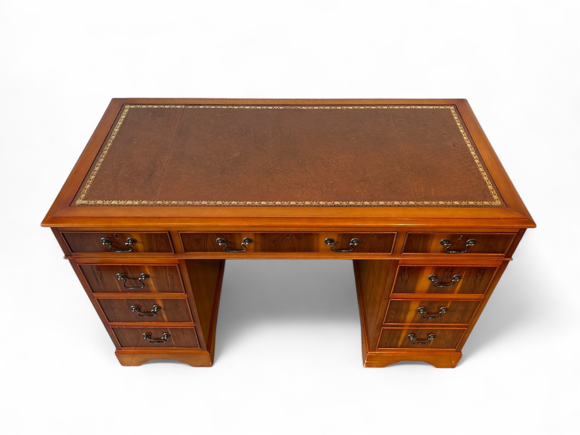 Elegant engelskt skrivbord i klassisk Georgiansk stil. Bordet har nio rymliga lådor med mässingshandtag och en exklusiv brun läderklädd skrivyta med dekorativ guldprägling.